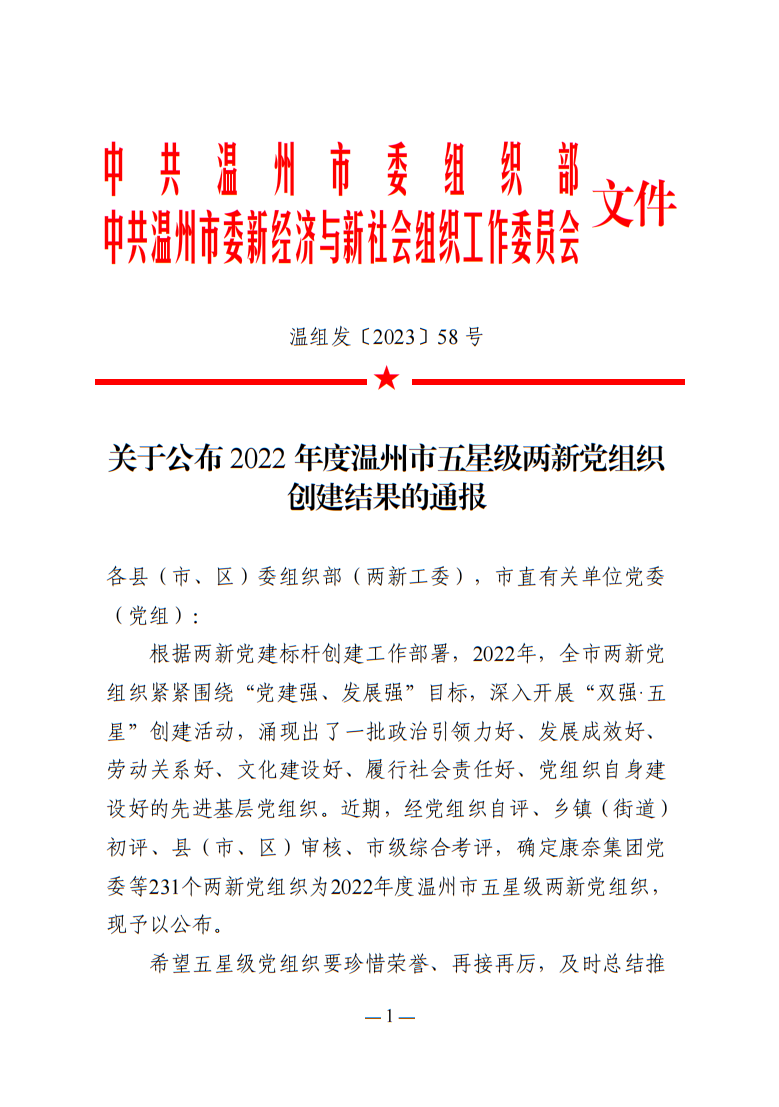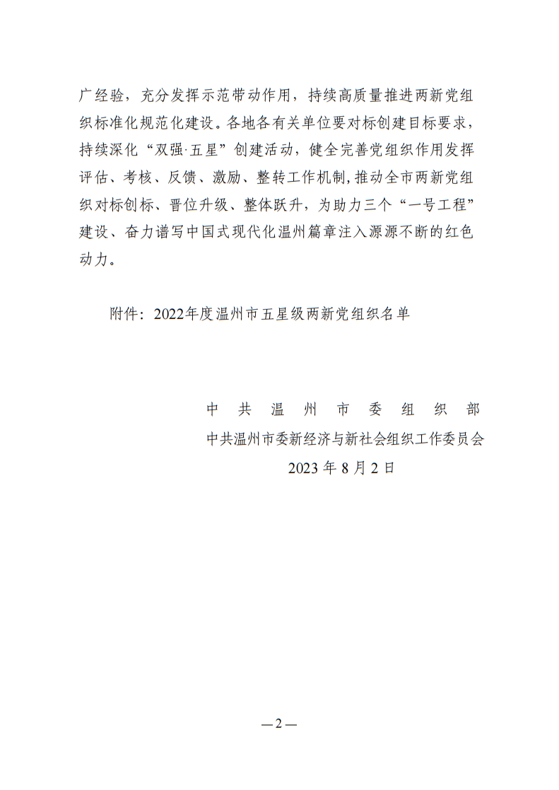 關于公布2022年度溫州市五星級兩新黨組織創(chuàng)建結果的通報